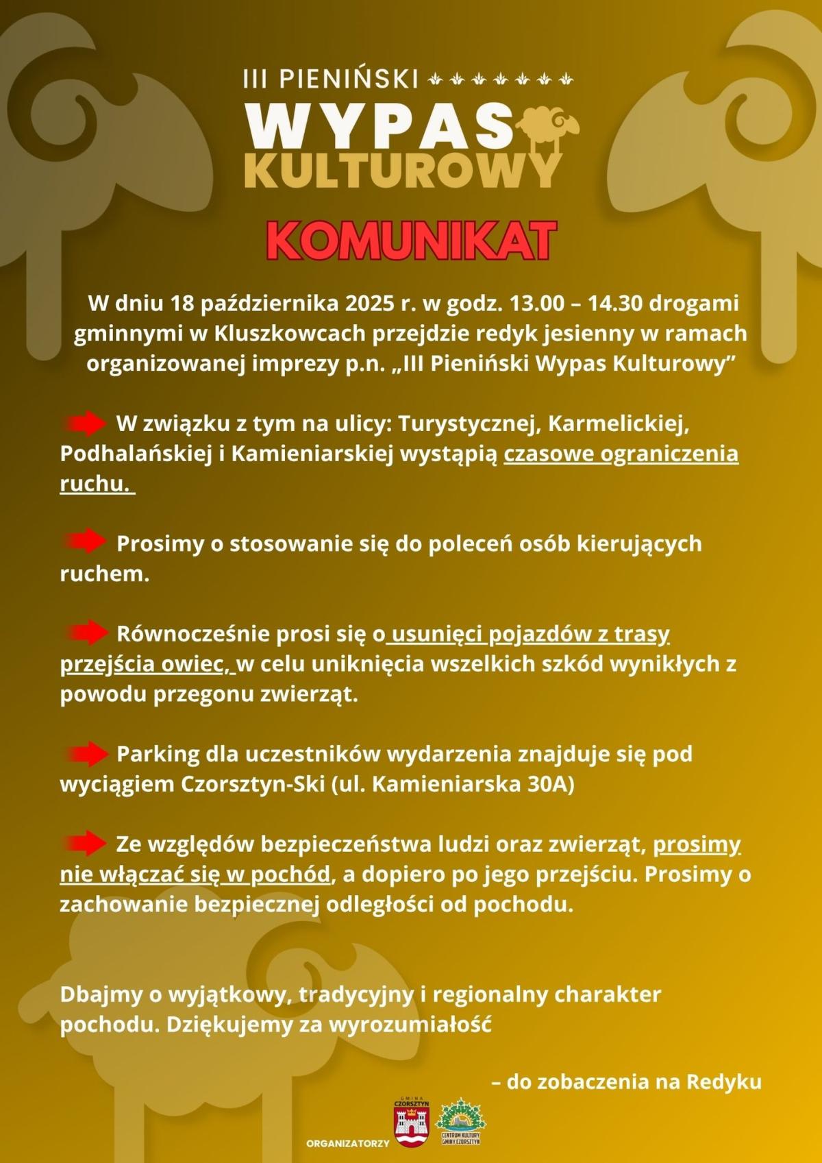 prosimy o zapoznanie się z trasą przepędu owiec i z komunikatem organizacyjnym.